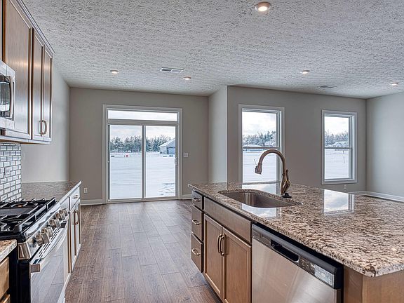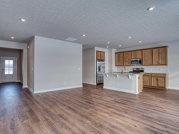 The Highland Series ranch plan boasts a spacious open-concept living space, perfect for daily living and hosting guests. The kitchen has a generously sized island, a walk-in pantry, ample cabinet space, and an expanded dining area that flows into the expansive family room, brimming with natural light. The kitchen includes granite countertops, a tile backsplash, and a stainless steel appliance package with a gas range. Attic storage is accessible in the garage. The owner’s spacious suite has an ensuite bath, including a double bowl vanity, a ceramic shower, and an enormous walk-in closet. Two more bedrooms, each with a walk-in closet, a sizable second bathroom, and a convenient laundry room are all located near the owner’s suite. RevWood Select Grandbury Oak flooring is throughout the main living areas and ceramic tile is installed in the wet areas. Jagoe TechSmart components are included. You’ll love this EnergySmart home!
