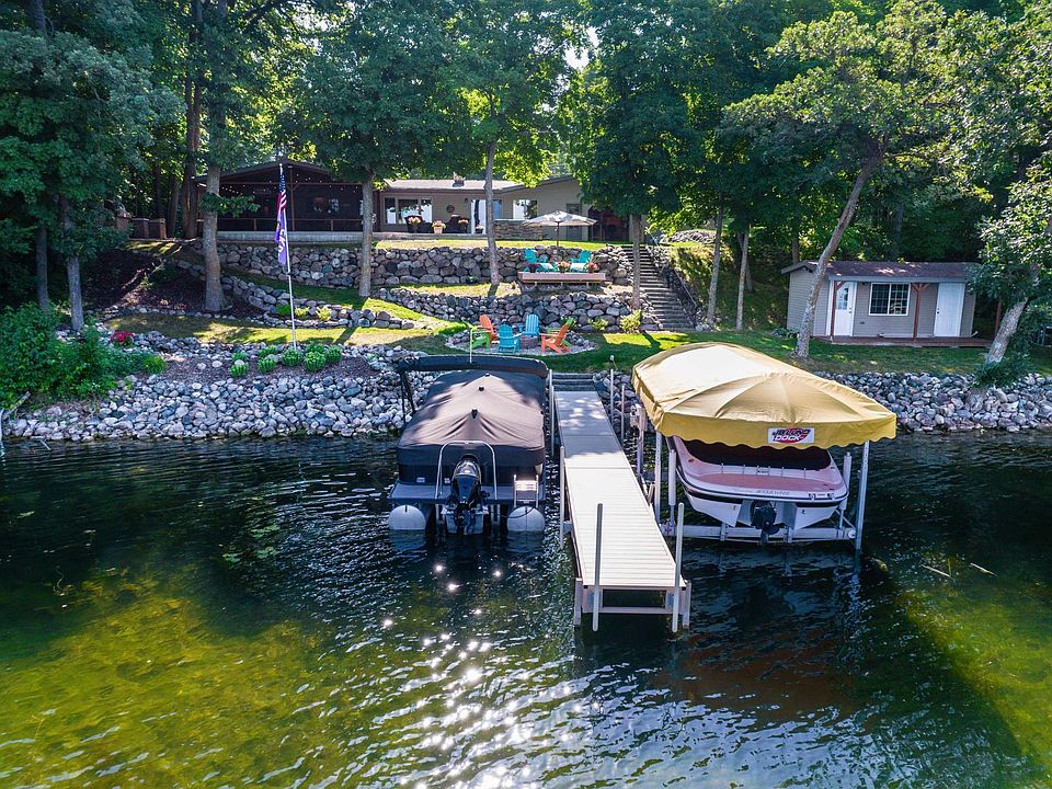 Access BIG PELICAN LAKE-Welcome to your dream property with stunning indoor and outdoor spaces. Custom remodeled home includes 4 bedrooms, 2 baths, with central air. Beautifully updated kitchen with stainless steel appliances, custom cabinets, and granite counter tops. Luxurious open concept master suite with a claw foot tub, walk in shower. Cozy gas fireplace in main living area. The spacious screened in porch is a definite favorite gathering spot for family and friends. Off the garage is another bonus room. Just open garage door to lake and enjoy! The salt water hot tub and dock are included! Create delectable pizzas from your wood-fire pizza oven in the outdoors. 2 stall heated garage and a newer 2+ stall detached garage. Lots of privacy from neighbors with 162 X 175 lot. Irrigation system. Turn the river on and enjoy the babbling brook as you will witness incredible sunsets. Quieter and intimate part of the Lake. Just 45 minutes from FM area and a 10 minute boat ride to Zorbaz!