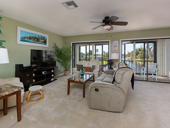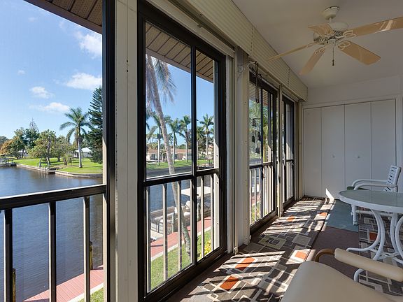 Spectacular southern exposure GULF ACCESS 2/2 TURNKEY 2nd floor end unit with intersection canal views. Open floor plan concept that encompasses two spacious bedrooms, two bathrooms, detached carport with an updated kitchen and inviting living room area that is great for entertaining. Sit out on your lanai while taking in the captivating intersection canal views while you enjoy the tranquil sunsets and watching the boating traffic go by. Many features including amazing views, roll down shutters in the lanai, boat dock, newer a/c, newer appliances, custom interior plantation shutters, meticulously maintained, low HOA & so much more! A short boat trip out to open water with only one bridge navigable access and boat dock to first come first serve. Community offers a pool area and cabana area. Located close to downtown Cape Coral with a short drive to the beach, dining, shopping and entertainment. Some of the furnishings, wall art and personal items do not convey. This amazing condo is ready for its new owner, investor or 2nd homeowner! Come see today because it will not last long!!!