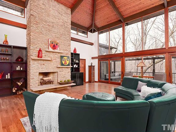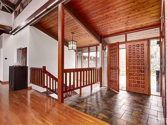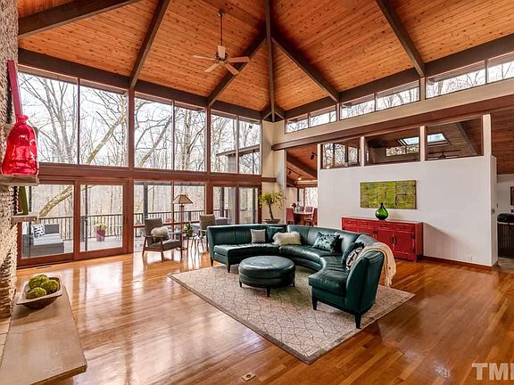 This modern deck home welcomes you with a breathtaking entrance of 21' soaring ceilings /windows. Main level has Master, his/her walk-in closets, office, dramatic open living area framing a treehouse view, kitchen, dining, deck and patio. Open basement level has cozy alcoves, homeschool/office area, exercise room, wetbar, 3 bedrms, dark rm, tons of storage! Whole house generator, 2 new HVACs 2017, new decks & miles of nbrhd trails thru the surrounding forest. Attached garage plus addtl detached garage.