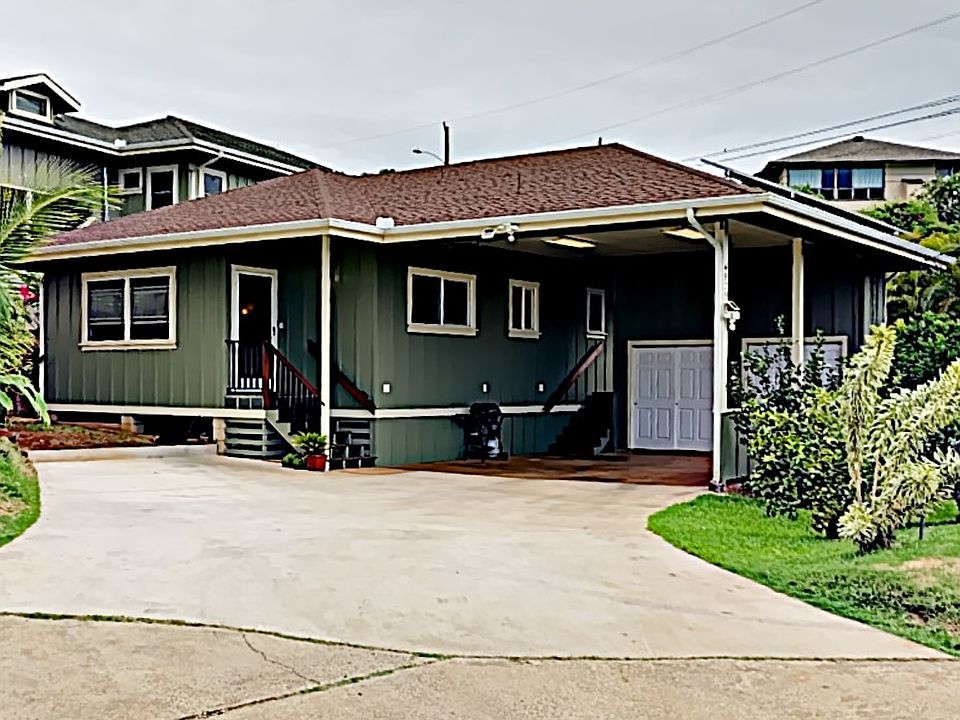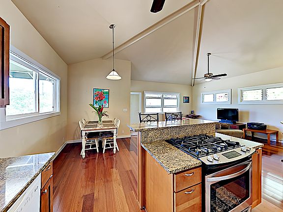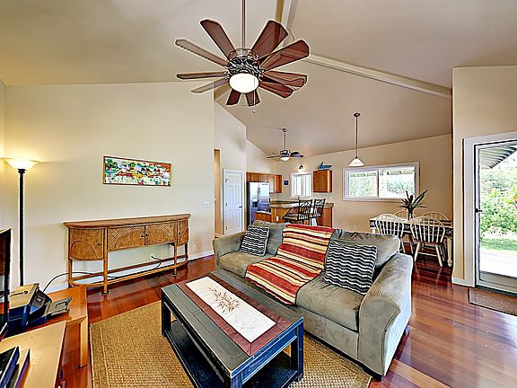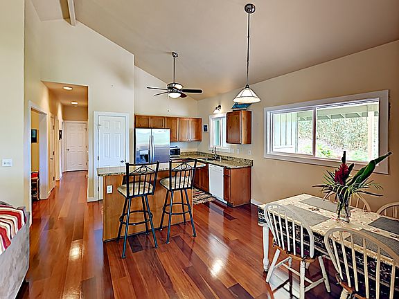 Beautiful 2 plus bedroom 2 bathroom 1024 sq foot ranch home built in 2006. Hardwood floors throughout with tile in both bathrooms. Cathedral ceilings makes it very spacious inside. Master bedroom has on suite bathroom and walk in closet with sliding glass door leading to lanai and steps down to Jacuzzi and outdoor shower in the lush backyard with plenty of tropical fruit trees and plants including orange, lemon, lime, sugarloaf pineapple, apple banana, papaya, dragon fruit and more. Brand new on demand tankless propane water heater, gas dryer and built in gas cook stove along with a 4kw, 15 panel owned solar system make this home very energy efficient. Fresh paint on the exterior and the bedrooms and bath inside. Celing fans in every room. 2nd bedroom has a large closet with mirror bypass doors. 3rd room could easily be used as another bedroom or office/craft room. Lots of storage in the 400 square foot covered carport with 13' ceilings. Beautiful custom exterior steps and lanai made with Ipe. New concrete driveway with room for a boat or trailer. This is a CPR lot. I have all the survey maps of the property. Lot is 5669'. **Note to realtors: I am not looking to list this property on the MLS. I will accept offers and pay a 3% commission. Home is owner occupied. Feel free to call for a showing.