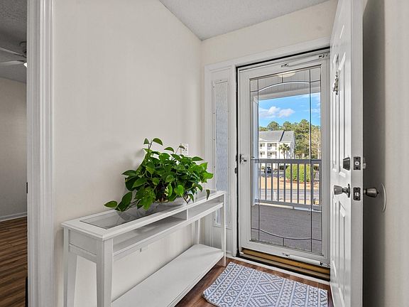 Welcome to this beautifully maintained and freshly painted 3-bedroom, 2-bath condo, located on the second floor at Windsor Green, a peaceful community. The master suite is thoughtfully separated from the other two bedrooms, offering privacy and comfort. High cathedral ceilings add to the spacious feel of the unit, and with no neighbors above, you’ll enjoy quiet, peaceful living. Plus, the pond views from the living room provide the perfect setting to relax and unwind. This end-unit condo features new LVP laminate flooring throughout, including the bedrooms, making it both stylish and easy to maintain. The side window lets in additional natural light, brightening up the entire space. As you enter the foyer, you’ll immediately notice the stylish butcher block countertops and spacious breakfast bar in the kitchen, designed to please any chef. The kitchen comes equipped with newer appliances, including an oven with a built-in air fryer, plus plenty of counter space for cooking and meal prep. At the back of the kitchen, there’s a convenient laundry room with a washer and dryer for extra storage and ease. The open-concept living/dining room combo flows seamlessly into the living area, where you’ll love the views of the pond through the sliding doors. Step outside onto the large screened-in patio and take in the peaceful surroundings. This end-unit even has a separate staircase at the back of the porch for added convenience. The master bedroom suite is generously sized and includes a walk-in closet and a private ensuite bathroom. For additional privacy, there’s also a private door leading out to the back porch. The two additional bedrooms, located off the foyer, are ideal for family or guests, and there’s a second full bathroom in the hallway. This unit boasts several recent upgrades, including a 2-year-old HVAC unit, new faucets, toilets, and appliances (including a garbage disposal), plus a Nest thermostat and fresh paint throughout. It’s truly move-in ready and even has it's own private exterior storage closet! Windsor Green is conveniently located just minutes from grocery stores (Publix, Kroger), restaurants, schools, shopping, the post office, the hospital, and even HWY 501, making it an ideal location. The community also offers great amenities, including a pool, clubhouse, BBQ area, and a playground for residents to enjoy.
