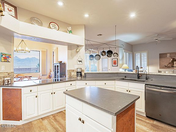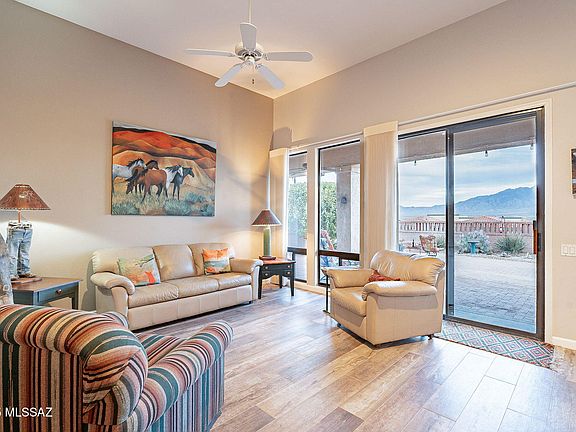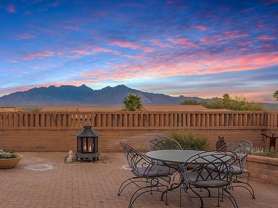 Tucked away in the enchanting landscape of Southern Arizona's premier active adult retirement community, this splendid residence epitomizes the ideal blend of luxury and warmth that discerning retirees desire. Upon entering, abundant natural light floods the space through expansive windows, framing the stunning eastern mountain views that promise to enliven your mornings with a touch of nature's beauty. The home features attractive porcelain tile flooring that mimics the charm of rustic barn wood, providing a warm and inviting atmosphere that flows effortlessly throughout the home. The kitchen is at the heart of the home, a culinary enthusiast's paradise. Adorned with crisp white cabinetry and striking slate countertops that include discreet pop-up outlets, the kitchen radiates sophistication. The timeless subway tile backsplash adds to its allure, while the double wall ovens cater to gourmet cooking needs. A generous center island is a functional workspace complemented by a striking honed granite breakfast bar, ideal for leisurely meals or morning coffee. Thoughtful renovations have opened the kitchen to the dining area, offering captivating views of the Santa Rita Mountains while whipping up meals. The inviting family room, featuring an electric fireplace, creates a cozy ambiance, perfect for socializing with family and friends. The primary suite is a serene retreat, boasting a meticulously remodeled bath that embodies spa-like tranquility. Indulge in the luxurious soaking tub or refresh in the lavish walk-in shower, designed to invite relaxation after a long day. The suite also includes double doors that reveal a versatile den or office space, leading to an additional area perfect for pursuing hobbies or creating an inspiring art studio. Additionally, peace of mind comes with the knowledge that a completely new roof was installed last year, replacing the original clay tiles with durable concrete tiles and eliminating concerns about this significant investment after you move in. Step outside to discover an expansive backyard equipped with two covered patios, providing a variety of seating areas ideal for entertaining or embracing peaceful solitude. Enjoy evenings under the vast Arizona sky, watching the sunsets transform the Santa Rita Mountains into a canvas of awe-inspiring colorsa daily spectacle that will become a treasured part of your routine. This home is a masterpiece of comfort and style in a vibrant and welcoming retirement community