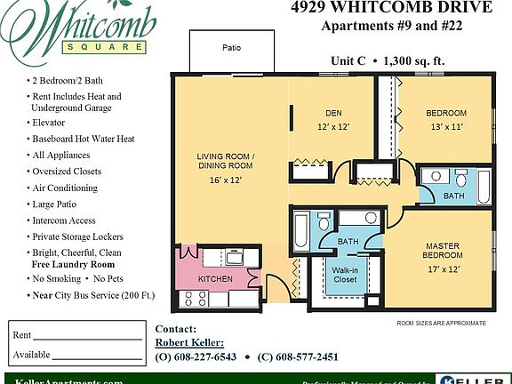 4929 Whitcomb Drive is part of Whitcomb Square Senior Apartments and offers charm you can't resist. At Whitcomb Square you'll have all the conveniences you've always wanted. No more worrying about repairs, maintenance, shoveling, mowing, property taxes or rising heat costs. Garage, elevator, free onsite laundry. Whitcomb Square Senior Home Apartments has a 2 BR / 2 BA + Den apartment Available 5/1. Apartment includes Heat, garage and storage locker. This home displays over-sized closets and large patio. Rent $1350 / month. We advise early inquiries - Turnover is low and demand is high. No Pets, No Smoking Please call 608-227-6543 for further details or to schedule a showing. If after 5 PM please call 608-577-2451. Included: Heat, Gas, Hot Water, Trash / Recycling, Water / Sewer & Parking.