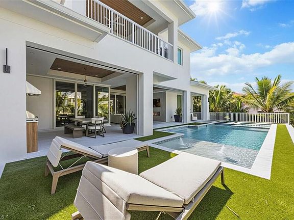 Experience the epitome of luxury living in this exceptional new construction home, perfectly situated in the heart of Olde Naples. Crafted by Refined Builders, this remarkable residence presents a rare opportunity to own a true masterpiece in one of Naples’ most coveted locations. Ideally positioned just minutes from the world-class dining and shopping of 5th Avenue South and 3rd StreetSouth, as well as Naples’ iconic beaches, this 4-bedroom + den, 5.5-bath home offers the perfect blend of luxury, comfort, and convenience—complemented by tranquil lake views from the 2nd floor and lush tropical landscaping. Wide-plank European oak floors and tongue-and-groove ceilings set a sophisticated tone, while the expansive great room flows seamlessly into a stunning gourmet kitchen featuring a quartz-clad center island, sleek two-tone cabinetry, and a full suite of premium Thermador appliances—ideal for both everyday living and elegant entertaining. Sliding glass doors lead to your private outdoor sanctuary, complete with a resort-style saltwater pool and spa, custom summer kitchen, and a spacious covered lanai—perfect for seamless indoor-outdoor living. The first-floor primary suite is a luxurious retreat with direct pool access and a spa-inspired bath featuring a soaking tub, oversized walk-in shower, and dual vanities. Upstairs, three ensuite guest bedrooms—including a VIP second master—are accessible via stairs or a private elevator. A bonus living room with wet bar, scenic balcony, and captivating lake views provides a relaxed space to unwind or entertain. Additional highlights include dual laundry rooms, a 3-car garage, tankless water heater, whole-house generator, and propane tank.