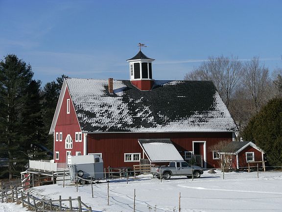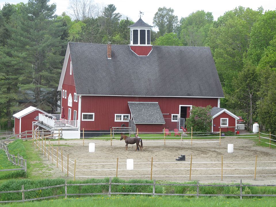 1860's bank barn contains large 2 story apartment with 2 balconies, three bedrooms, 2 baths, brick hearth with functioning Jotul wood stove, beautiful views. basement is finished to include working stable for horses with 3 box stalls, laundry room with cold/hot water and hay and grain room. Includes separate hay barn (500 bale capacity), separate tack room/study with gas fireplace, satellite and phone hook up. Grounds have 50 foot round pen, outdoor arena (90x100) and detached run under stall. Two brooks on property and acres of well-maintained pastures.