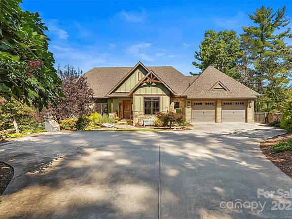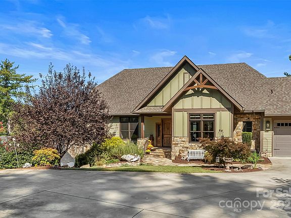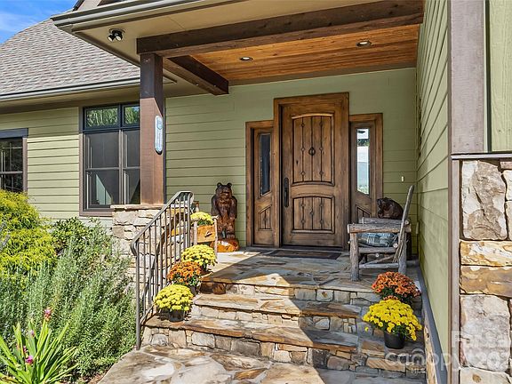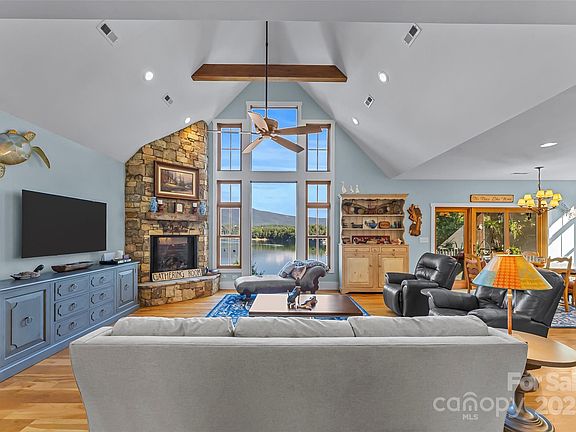 This exquisite lakefront home offers breathtaking Blue Ridge and long water views, creating a serene backdrop for luxurious living. The main level features an open great room with cathedral ceilings, a gas log fireplace, and large windows that flood the space with natural light. The chef's kitchen is a highlight, complete with a Thermador 6-burner cooktop, wall oven, large island, and adjacent laundry for convenience. The dining area seamlessly connects to a screened porch, ideal for outdoor meals while soaking in the views. The main primary suite offers a private retreat with an ensuite bath, while a second bedroom and full hallway bath complete the main level. The lower level boasts two additional bedrooms, a hall bath, a spacious family room with a wet bar, and an exercise room. Outside, you'll enjoy the stone patio with a firepit that is perfect for relaxation, while the fenced pet area and koi pond add charm to the landscape. The property also includes a UTV/golf cart garage or basement workshop. Reach the lake via the cart path or stone steps and enjoy the covered dock with lift. Additional features include a 2 car garage, radon mitigation system and full-house generator for peace of mind. See aerial sky tour at https://tours.3amvirtualmedia.com/tours/4EDXNReL3?mls=1