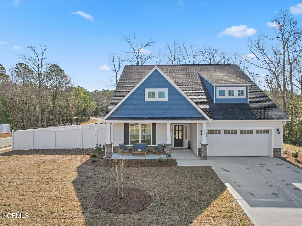 Welcome to your coastal oasis! This exquisite home offers the perfect blend of elegance and comfort. As you arrive, a paved driveway, 2-car garage, and a charming covered front porch with stone columns frame the entrance, hinting at the luxury within. Gather with loved ones and neighbors in the fenced-in backyard, complete with a patio ideal for grilling and chilling. Inside, the kitchen is a chef's delight, featuring stainless steel appliances, pristine white cabinetry, granite countertops, and an oversized center island ideal for meal prep and casual dining. The adjacent living room beckons with a cozy fireplace, creating a warm ambiance for gatherings, and offers access to the backyard. Retreat to the primary suite, where a gorgeous ensuite bathroom and spacious walk-in closet await, providing a private haven for relaxation. Upstairs includes two bedrooms, a full bath, and a versatile bonus room offering endless possibilities. Conveniently located mere minutes from the pristine beaches of Oak Island and Holden Beach, as well as the historic charm of Downtown Southport, this home ensures you're never far from coastal adventures. With quick access to Highway 17, commuting to bustling Wilmington or vibrant Myrtle Beach is a breeze. Don't miss the opportunity to make this coastal gem your own!