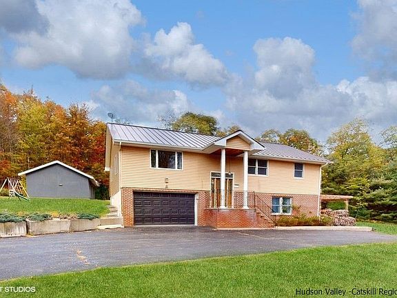 Tucked in the midst of a scenic forest, this inviting custom built home sits atop a serene knoll, boasting 4.5 acres of natural beauty accessible via a winding country road and a paved circular driveway. Step into this 2500-square-foot raised ranch, thoughtfully designed with four spacious bedrooms, three bathrooms, and a spacious kitchen. Sunlight fills the living room with picturesque mountain views. Whether you're seeking a full-time residence, a weekend escape, or something in between, this move-in ready home ticks all the boxes. Situated in a tranquil countryside setting, this home offers peace and quiet, yet it's just minutes away from the vibrant, hip Village of Ellenville where you'll discover excellent restaurants, quaint shops, museums, pop up art exhibitions and the renowned Shadowland Theatre. Nature lovers will appreciate the property's proximity to Sam's Point Preserve and the Shawangunk Scenic Byway, making it an ideal location for exploring the outdoors. With a semi-private suite on the lower level and a detached guest house with kitchen and full bath, there are countless possibilities for extended family, friends or Airbnb. The versatility of the two-car garage in main house and separate garage for the guest house, makes it ideal for hobbyists or artists seeking a dedicated studio space. This home is designed for year-round living, with a wood-burning stove for cozy nights, a backup generator, and central AC. After a day filled with hiking, biking, and exploration, unwind in the hot tub and indulge in stargazing from the comfort of your own oasis. Come and see how this magnificent Hudson Valley home blends seamlessly with nature, offering a retreat that's perfect for all seasons!
