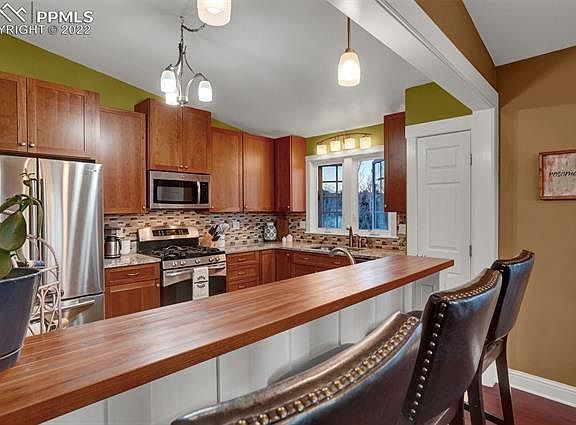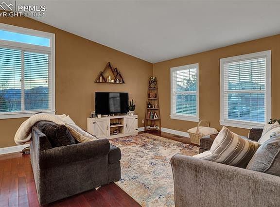 VIEWS, VIEWS and MORE VIEWS!!! This updated and move-in ready home is situated on a large lot on a quiet cul-de-sac in the desirable Old Farm neighborhood. The upper level has an open-concept floorplan and is surrounded by large windows that bathe the space in natural light and provide a view of Pikes Peak and the Front Range from inside the home. Natural Cherry wood flooring provides warmth and elegance and flows throughout the home (no carpet to worry about)! The spacious living room has vaulted ceilings and leads into the dining area with sliding doors that have built-in blinds that lead onto the enclosed, low-maintenance TREX deck where you can soak up the Colorado sunshine while admiring the mountain views! The updated kitchen is simply stunning with granite countertops, staggered cabinets with lighting, slow closing drawers, stainless steel appliances, a gas cooktop, pantry, a secondary sink and a breakfast bar with seating. A hallway leads you to the spacious primary bedroom with double closets and private access to the upper level updated bathroom with a skylight, tile flooring and stacked brick tile surround at the tub area. A secondary bedroom is on this level along with a large laundry room with a window, utility sink, built-in cabinets and shelves and even a built-in ironing board! The lower level has a new barn door the leads into the cozy family room with a wood burning fireplace that is surrounded by built-ins to display your treasured items. Off the family room is the 3rd bedroom with a walk-out to the covered patio and a private, updated en-suite with a rain shower! This home has so many extras including a new garage door, energy efficient furnace and A/C, updated hardware and light fixtures, smart thermostat, custom baseboards, extra storage space in the garage and under the stairs and a storage shed! Close to trails, open space, a park and the Powers Corridor with it's many amenities the location can't be beat! Come fall in love today!