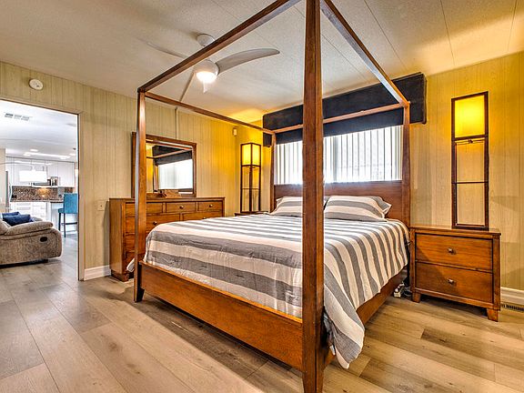Welcome to Indian Springs, a 55 plus community. This 2-bedroom, 2-bathroom home offers 1,440 square feet of stylish and comfortable living space. As you step inside, you'll be greeted by a well-designed open floor plan that seamlessly blends the living, dining, and kitchen areas, creating the perfect space for entertaining or simply relaxing. The kitchen boasts stainless steel appliances, a double oven, and a convenient breakfast bar, making meal preparation a delight. Enjoy breathtaking mountain views during the day and city light views at night from your private outdoor space, perfect for unwinding after a long day or hosting gatherings with friends and family. This unit comes with the convenience of a washer/dryer in the unit, air conditioning to keep you comfortable year-round, and a storage shed for your convenience. You'll also have covered parking for up to 3 cars, ensuring that your vehicles are always protected. Not only does this home offer a peaceful location on a greenbelt with 180-degree views, but it's also very close to the pool, clubhouse, and outdoor living/entertainment areas, adding to the overall appeal of the property. Upgrades including dual pane windows and luxury vinyl plank floors provide modern comfort, while the bathroom tile adds a touch of luxury. Situated just moments from El Paseo's restaurants and shops, this home offers the perfect balance of tranquility and convenience. Space rent is $759.00 per month and is eligible for financing.