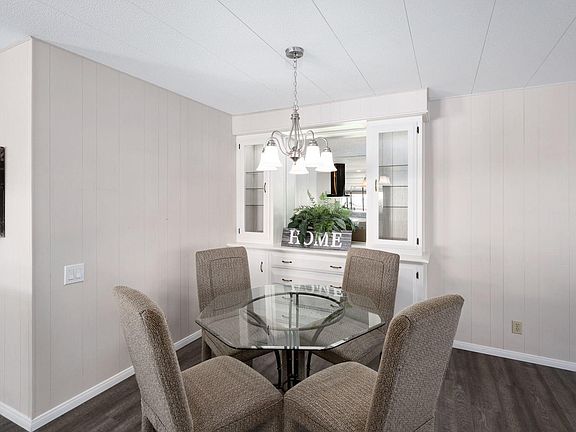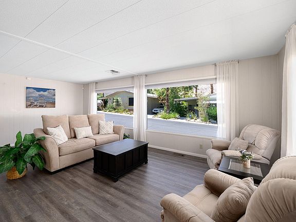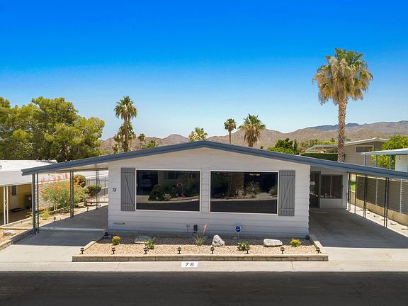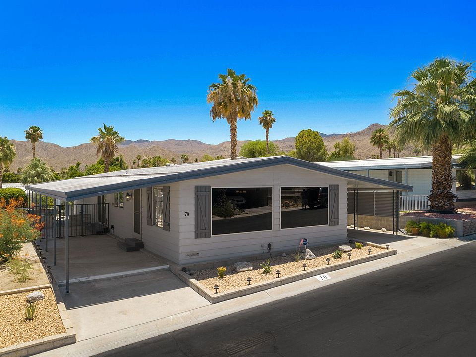 Location, LOCATION, Location!! Situated in desirable South Palm Desert, high above the valley floor and at the foot of the Santa Rosa Mountains, sits Indian Springs MHP, a hidden gem for residents 55 years or better. Considered one of the nicest and friendliest mobile home communities in the Coachella Valley, Indian Springs offers well-maintained and manicured grounds, a large community Clubhouse with pool/spa, shuffleboard, billiards and a card room. This beautiful and spacious 2 BR/2 BA home sits away from the main Hwy so it's quiet and boasts outstanding MOUNTAIN & VALLEY VIEWS. The interior has been recently refreshed with new laminated wood floors throughout, an UPDATED KITCHEN and a newer energy efficient HVAC system. The large master bedroom suite includes a generous en-suite bath with dual lavs, vanity area and two large closets. The Guest Bedroom has direct access to a guest bath for added privacy. There's also an 18x20 BONUS ROOM just off the carport. The patio is completely fenced in and has amazing views, multiple fruits trees and easy care landscape. Move-in Ready for immediate enjoyment as a primary home or vacation home. You'll love the location and views!