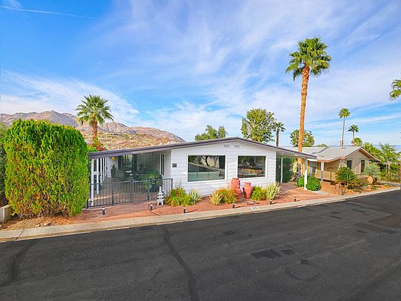 Indian Springs is nestled into the foothills of beautiful South Palm Desert and peacefully quiet. It is a 55+ community with beautifully maintained park. The community boasts a large community pool, spa and some of the best hiking right outside your door. This 2 bedroom 2 bath home has been meticulously remodeled with a modern open floor plan. The spacious kitchen includes quartz counters, skylights, slow-close cabinets and drawers, stainless double sink, Bosch appliances and Electrolux refrigerator, Electrolux washer and dryer. Master bedroom has a huge walk-in closet, large mirrored closet and a linen closet. The exterior has been landscaped with beautiful desert touches and located on the very private mountain side of the park. Space rent is $803.00 a mo, There are no property taxes. Includes water, sewer, Clubhouse, pool and Jacuzzi. Furnishings are negotiable under separate contract.