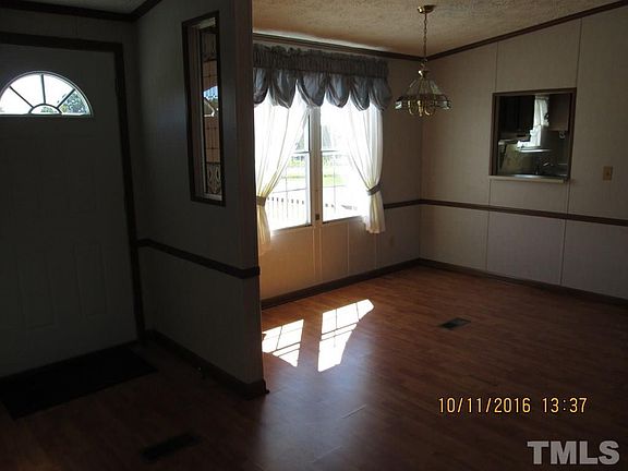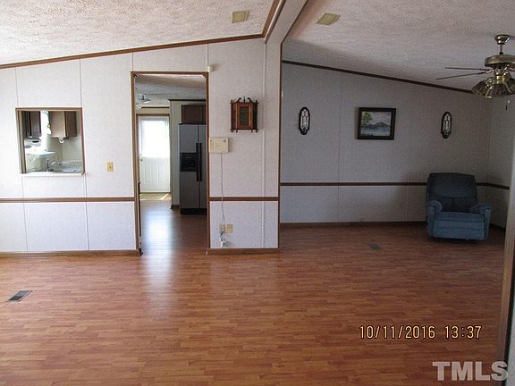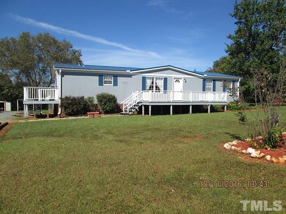 3.77 acres in the Country, NO RESTRICTIONS, 25 minutes to Cary, 35 to Bragg, 45 to Chapel Hill. 3 Bedrooms, 3 Bath Triplewide manufactured home with a very large open Family, Dining, & Kitchen with updated appliances, TaxCard say 1785sq.ft. It has a detached 32' x 32' building that can be an inlaw or guest suite, workshop, Bonus, Office, has its own Heat Pump, septic tank, Kitchen sink, & bathroom, TaxCard say 1024sq.ft. Both home & detached r on the same meter,2 yr old Metal Roof. Lot is mostly cleared.