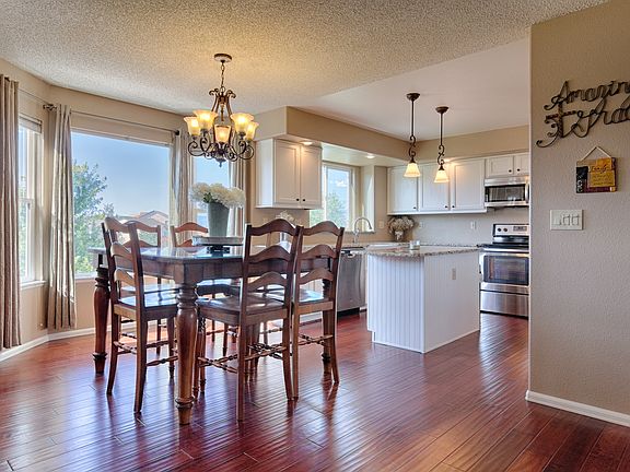 Beautiful 2-Story w/ finished walkout basement backs to open space w/ stunning mountain views ~ such an amazing Wagon Trails location to find this one owner occupied home w/ upgrades! The main level features a gorgeous tile entry followed by hand scraped maple floors throughout the main lvl. An open living room flows to the eat-in kitchen, complete w/ slab granite countertops, white cabinets, a beautiful window at the sink, stainless appliances, & dining nook. The custom deck provides the greatest views for cookouts and flows perfectly from the dining and family room space for maximizing hospitality. The family room has custom built-in's and a gas fireplace. Upstairs, the master retreat is accented w/ a vaulted ceiling, French Doors that open to the 5-piece bathroom, a walk-in closet, and amazing views! Two additional bedrooms both w/ window seats and a full bathroom complete the upper level. Downstairs, the walkout basement is bright and cheery, providing room for a recreation space, 3/4 bathroom, and large bedroom ~ it's the perfect separate suite. Also, walk out from the lower level to the lower patio area and then enjoy the back yard, where the goldfish pond will captivate you. The landscaping is beautiful and lush, and the back yard is fenced where you have maximum rear distance to neighbors w/ the open space behind. This is the one that has been worth the wait! See it today and you will not only love the home, you will love access to the neighborhood pool, park, walking trails, access to hospitals, schools, shopping and more!
