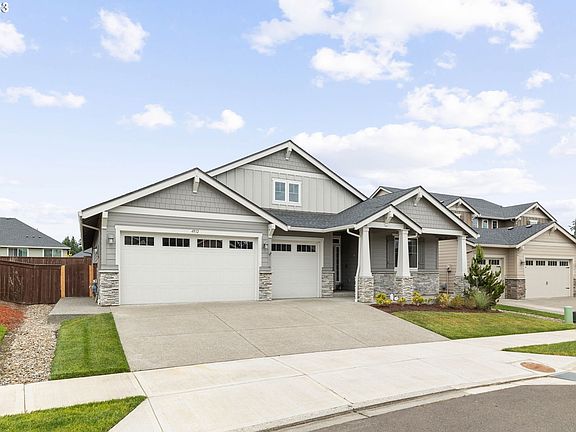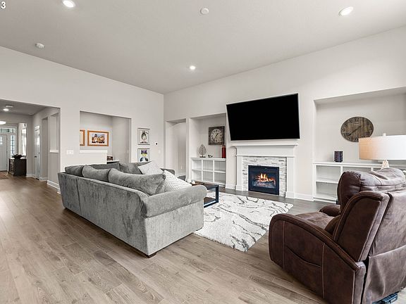 MOVE-IN READY! This one level home offers quality features in like-new condition. Open floor plan with high ceilings and upgrades throughout. Great-room with built-ins and gas fireplace open to gourmet kitchen with large island, quartz slab counters, pantry, 5 burner gas cooktop. SS Appliances, custom pull-outs in lower cabinets and spacious dining area. Tech center/office area. Spacious primary suite offers spa-like bath with soaking tub, tile shower and floors, double vanity and walk-in closet. 2nd and 3rd bedrooms with bath are on opposite side of the home for nice privacy. Laundry room with utility sink, cabinets and a large pantry area for added storage. Garage features custom cabinets along the entire width Enjoy the fenced backyard with covered, extended patio. Lennar built home with built-in wifi booster, ring doorbell, sprinklers front and back. HOA maintains the front yard. So much to offer in Ridgefield including walking trails, shopping, dining, winery, downtown waterfront.