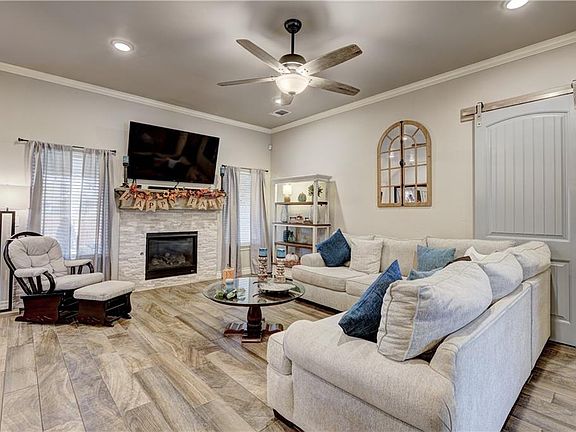 Beautiful home on a quiet cul-de-sac. The large front porch and entryway make a great first impression. The main open living areas include tall ceilings, wood look tile, granite countertops, gas cooking stove, large dining room, gas fireplace, and a sliding barn style door to accent it all. It’s a 4 bedroom, 3 bathroom home with a large bonus room. The bonus room could easily be used as a 5th bedroom or secondary suite. It has bedroom door, large closet, and full bathroom. The primary suite is amazing! Large bathroom complete with double vanity, walk-in shower, and jacuzzi tub. The walk-in closet is designed with tall ceilings perfect for seasonal clothing. Enjoy a nice cool evening next to the wood burning fireplace on the large covered back porch. This home also has a tankless hot water heater, storm shelter, and sprinkler system. Here’s a bonus! Backyard table, chairs, rug, lights, tv, bench swing, trampoline, and play-toy are included. Anything can be removed that is not desired.