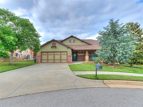Charming custom Craftsman style 3 bed, 2 bath home nested on quiet cul-de-sac in sought-after East Edmond, Arbor Creek neighborhood. Welcoming, expansive covered porch has swing, large landscape rocks and beautiful views. Open concept, split floor plan boasts hardwood throughout foyer, living, kitchen, dining and halls. Living has stone fireplace and cathedral ceilings with custom beams & paneling. Kitchen offers island with storage, granite counters, breakfast bar, pantry and farm style sink. Dining has great views. Primary suite has double vanities, granite, jetted tub, large shower and walk-in closet. 2 other bedrooms and living have easy access to 2nd bath with granite counters and tub/shower combo. Outdoor pergola, covered patio, landscaping, and privacy fence create the perfect canvas for your outdoor retreat. HOA dues includes voucher for 2 annual passes to Lake Arcadia. Located 1-3 minutes from I35, shopping, restaurants, super Walmart, Samclub, movie theater and Lake Arcadia.