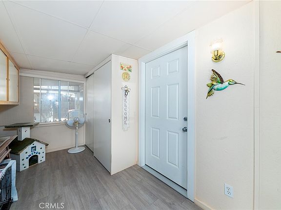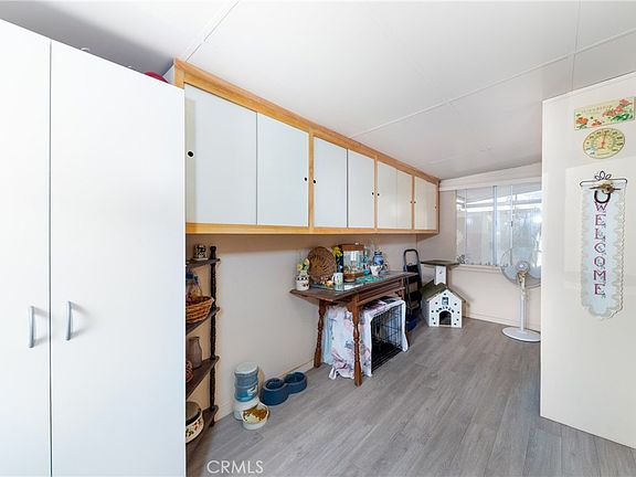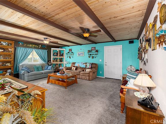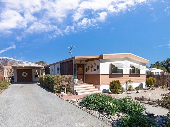 THIS IMMACULATE CUL-DE-SAC HOME IS ON A PERMANENT FOUNDATION, in a nice neighborhood of Cabazon with great views of the San Bernardino and San Gorgonio Mountains, that is close to Hwy 10. Enter into the bonus room with gray laminate flooring, lots of custom-built cabinets for extra storage, and a large closet so it can be used as a guest room or office. Then into the living room that has a custom design with wood-beamed ceilings, newer carpet and surround sound. In the kitchen and dining room area there is tongue and groove Oak wood flooring. Kitchen has lots of cabinet space with pull out drawers for easy access and the dining area has a custom built-in shelving. This home has been updated with most of the walls having drywall with modern colors that look very stylish. In the master bedroom you have crown molding, custom mirror/closet doors with built-in drawers and built-in shelving and the other bedroom have a built-in desk with cabinets. The hall bath has a large walk-in tile shower and the master bath a nice soaking tub and shower. There are added features, a ceiling fan in every room, new stylish shaker doors, 50-gallon water heater, and skylight in the hallway. This home has tall newer wood fencing on both sides that gives privacy. Lots of parking, one car detached garage with aluminum siding that has a newer roof, and two other covered parking spots, 3 storage sheds. The yard has been nicely landscaped with low-watering plants, there is an orange, lemon, and a tangerine and pomegranate tree, all with great tasting fruit. This is a MUST-SEE HOME!