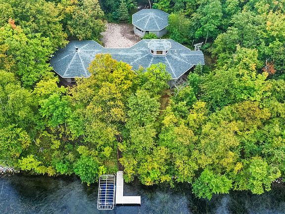 FISH/PELICAN LAKE: Unique, one of a kind, multi-octagonal Fish Lake home. With over 5,400 square feet of elegant living space, 14-foot vaulted ceilings, Canadian Timber Frame Beams and Natural Maple Floors, this home is a rare find. Nestled in two acres of mature trees, with 280 feet of lakeshore, this property provides both space and privacy. The north octagon includes a well-appointed kitchen with a huge island and granite countertops, dining room and great room with fireplace and patio doors to the deck. The south octagon hosts the master suite with fireplace, walk in closet and huge master bath; library; music room; screened porch plus a unique 2nd floor observatory with timber spiral stairway and tamarack log beams. The huge basement has a large bedroom, full bath, a spacious office, Finnish sauna, and several finished storage areas. A two-car garage plus a 16 X 24 storage building provide space for the cars and equipment. Plus, an automatic generator to keep the power on.