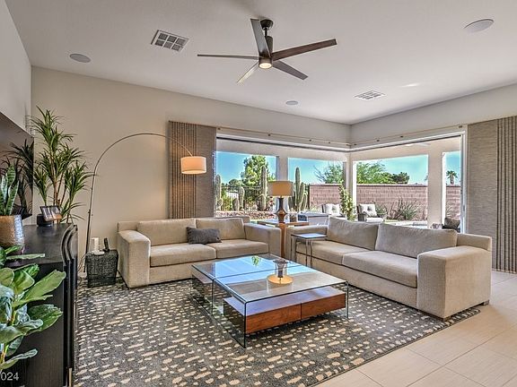 This stunning former model in Ovation has 3 bedrooms, 3 baths, 3 car garage, den & offers a luxurious 2,516 sq ft of living space, perfectly complemented by breathtaking golf course and mountain views. The open-concept layout includes a primary suite and additional en-suite, modern kitchen with sleek countertops, a center island, dual dishwashers and a built-in wine fridge. This former model was the crown jewel of the neighborhood with too many upgrades to list. The back of the home is a wall of glass that easily slides open, ideal for entertaining and relaxation. Step outside to your private oasis featuring a sparkling pool surrounded by a meticulously maintained yard landscaped to perfection. Ample patio space for relaxation or gatherings with built in BBQ, all overlooking the golf course pond and mountains. The spacious primary suite offers a tranquil retreat, while large windows throughout the home flood the interior with natural light, showcasing the gorgeous surroundings.