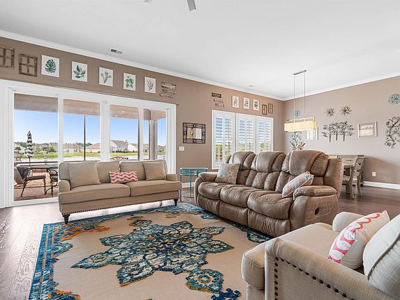 Attractively appointed single level home with magnificent lake view in a natural gas community with an abundance of amenities! From the moment you enter the front door, you will be impressed by the spaciousness of this home with high ceilings and expansive view of the largest lake in this community. Open floor plan with generously sized rooms and plantation shutters in main living areas. Family room with large scale ceiling fan, custom built shelving with wine fridge and fireplace. Kitchen with bar, pantry, stainless appliances, granite counters, and breakfast nook. Primary bedroom with tray ceiling, walk in closet, and ensuite double vanity bathroom with garden tub and separate shower. The outdoor living space is truly notable, with screened porch, paver patio with built in grill and bar, fire pit, and retractable awning all overlooking the beautiful lake. An extra feature that adds to the pleasurable living in this home is the retractable screen on the front door. Close just the screen doors on the front of the house and the back of the house, and you get an amazing cross breeze! Garage floor is epoxied and there is a built in drop zone just inside the garage entrance. Tile in wet areas, luxury vinyl plank in living areas and primary bedroom, carpet in the 2 guest bedrooms. Landscape curbing and decorative rocks are attractive and make lawn maintenance easier. Community has 2 pools, pickleball court, fishing pier with stocked pond, playground, and recreation area. Community is very convenient, being located right off Hwy 707 with plenty of shopping and medical offices and just a couple miles from Hwy 31 which gets you anywhere in the Grand Strand quickly and easily. *Measurements and square footage are approximate. The buyer/buyer's agent is responsible for verifying ALL information in the MLS including lot size, HOA information, square footage, etc.