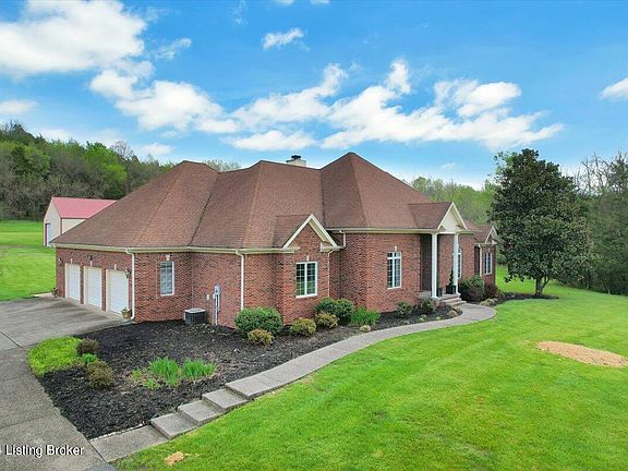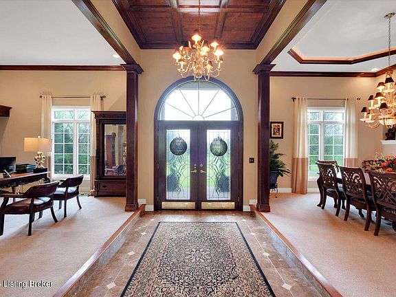 almost 5 acres. It is ideal for holidays gathering and summer cookouts. The foyer has marble floor which leads to the formal dining room and study, both with beautiful built-ins, and a large, open great room with coffered ceilings, and a wall of windows overlooking the patio and backyard. The kitchen has cherry cabinetry, granite countertops w/marble backsplash, a double fireplace that can also be enjoyed from the great room, and a sunken breakfast/Florida room. From the breakfast room, simply step out to the private patio to enjoy the peaceful nature setting. The spacious primary bedroom offers a large walk-in closet, a fireplace that can also be enjoyed from the primary bathroom which has double vanity sinks, a jetted tub and walk-in shower. The partially finished basement is where you'll find a bonus room that can be used as a bedroom, full bathroom, family room with another fireplace, workout room, bar, and theater/media room. In addition to this finished space is a large storage room. There is a 3-car attached garage and a 2nd garage located in the barn in the rear of home which is partially being used as an office with a half bath, heating and air conditioning. The barn's large storage space can easily be turned into a stable. This home has easily accommodated over 50 people during holiday gatherings and is truly one of a kind. Call to schedule a tour today!