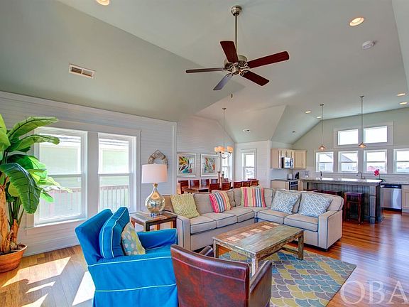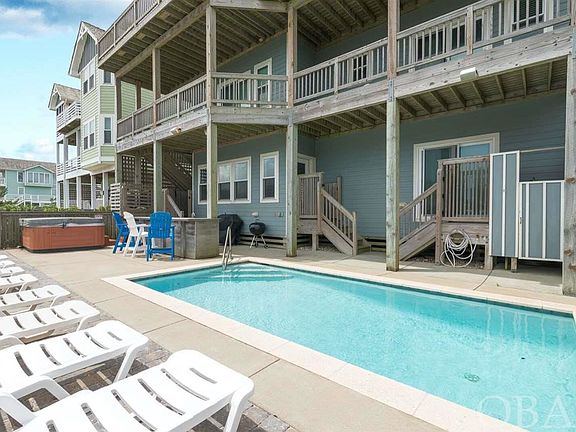 This 7 Bedroom Semi-ocean front home is a true home away from home. Located in the heart of Nags Head, your toes can be in the sand with a short walk across the street to the private beach access, that features a gazebo, restrooms and showers. Luxury finishes and large rooms are easily accessed the the elevator or stairs. Separate game room, Bathroom with direct pool access keeps the party outside during the day. Large pool and tiki bar complete the back yard. Shopping and dinner are nearby. Below explains the layout LEVEL 1: Carport, entry (four steps to the doorway from carport), rec room with pool table, Queen master bedroom, private pool, cabana bath. LEVEL 2: Handicap friendly Queen Master Bedroom with covered porch access, King Master Bedroom, Queen Bedroom with deck access, King Bedroom with deck access, Master Bedroom with Pyramid Bunk and deck access. Full Hall Bath LEVEL 3: King Master Bedroom and deck access, half bath, living area with deck access, dining area, kitchen.