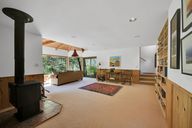 - Features: Beamed Ceilings, Builtin Features, Deck, Sliding Doors, Wallto Wall Carpet, Wood Stove