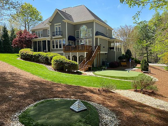Your French Country dream home is beautifully landscaped on 1.38 acres in tranquil Sunset Lake Estates. Upon entering the stately front doors on the wrap-around-porch, you'll know this beauty is perfect for entertaining or family gatherings. Flowing open concept on main floor with 2-story family room, exquisite crown and baseboard molding, gourmet kitchen w/island, stainless steel appliances, formal dining/lounge, mud area/drop zone from garage, and large laundry room. Exterior offers screened porch and deck on main level, patios and stone fireplace at basement level with 2 golf tee boxes to a large putting green, & 3 car side-load garage. Sunny walk-out basement houses theatre room, fitness area, wet bar, wine cellar and 5th bedroom with full bath for maximum guest privacy. Unfinished top floor with encapsulated foam insulation provides ample storage opportunities. Many extras, including 3 interior gas fireplaces, hardwood floors, central vacuum, epoxy garage floors, water softening system, and 12-zone irrigation. Contact us at tarheelfan@nc.rr.com or 919-749-6311 to schedule your personal tour (buyer's agent fee provided at closing).