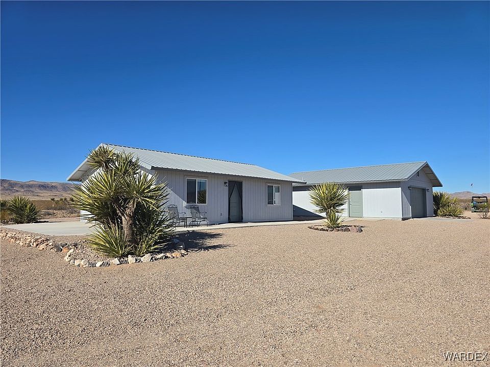 IMMACULATE BOTH INSIDE AND OUT, welcome home to this darling desert gem that has it all. Located on a 4.70 acre fenced parcel, approx. 1 mile off pavement with beautiful panoramic mountain and valley views. Looking to downsize a little? Then this move in ready home with furnishings included is for you, featuring 768 sq. ft of well thought out open concept living space, 1BR, 2BA, a nice size galley kitchen with a rolling work island and plenty of cabinet space. Casual dining area off the kitchen with a door leading out to the South patio area a perfect place to sit, relax, entertain family and friends and dine Alfresco all the while taking in the beautiful views of the majestic Black Mountains to the West. The wide hallway with built in storage leads you to the bedroom and generous size full bathroom. Additional interior features include lots of windows to let in natural light and the amazing views, luxury vinyl flooring throughout, heavily insulated to keep you cool in the summer and warm in the winter, wired for a dishwasher, microwave and ceiling fans if you so desire to add these. There's a detached 768 sq. ft. finished garage with a 3/4 bathroom and a room that could be used for guest visiting, washer and dryer hookups, the washer and dryer stay. Exterior features include metal roofs on both the home and garage, concrete walkways around the home, minimal easy care desert landscaping and rockscape, the exterior was painted in 2023. For family and friends visiting with an RV there are full RV hookups with a 20 amp and 50 amp plug. Come and explore our beautiful Arizona desert, sunrises, sunsets and starry night skies from this charming property. Don't wait call a Realtor and schedule your personal showing today.