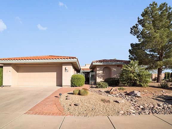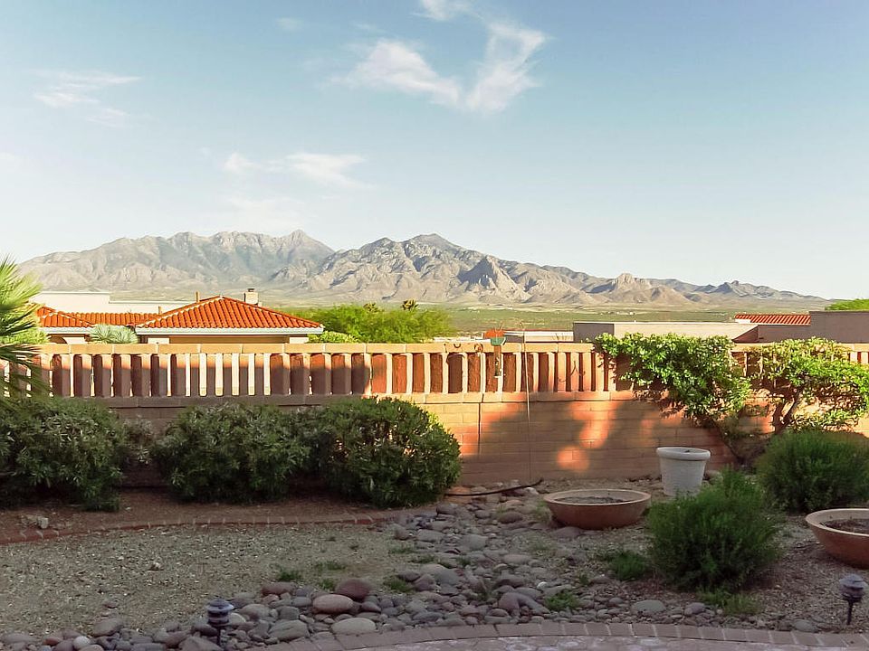 A home offering great curb appeal with Mediterranean roof lines, multi colored rock and desert shrubbery, desert palms and cactus. A wood entry door with 2 side lite panels leads you to a living room featuring a 3-sided fireplace and a wall of windows with stunning views of the Santa Rita Mountains. The heartbeat of this home is a family room with its built-in media center which opens to the kitchen with a prep-cook island encircled by an abundance of white cabinetry. Escape to your peaceful master bedroom and spoil yourself in the luxurious jetted tub centered under two large glass block transom windows. The guest bedroom is also a master suite with private bath. Settle in on your backyard covered patio and relax to the sound of your trickling fountain as you enjoy