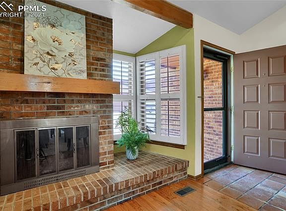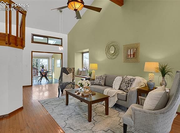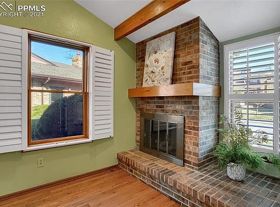 Low maintenance townhouse located in the middle of the city! Mature trees throughout the neighborhood, perfect for peaceful walks! Beautiful covered entryway features a glass storm door, tile flooring, plantation shutters, and a coat closet. The entryway flows into the great room adorned with two-story ceiling, wood floors, and a gas fireplace with a brick hearth and wood mantle. Adjoining the great room is a gorgeous dining area or sun room with brick flooring, a skylight, and access to 9x6 wood deck with stunning Pikes Peak Views! A functional passthrough window connects the dining room and kitchen, perfect for entertaining! The kitchen has been updated with Corian countertops featuring an under-mount sink and travertine tile backsplash. The Corian counter extends out past the sink into the garden window perfect for growing herbs and flowers! The kitchen is also adorned with a terracotta tile floor and a pantry with pullout shelving. Also located on the main level is a linen closet, the laundry room, and a master bedroom with site-finished hardwood floors, closet, adjoining full bath adorned with terracotta tile floors and a spacious vanity with plentiful storage! The upper level features a second master suite (also featuring gorgeous site-finished hardwoods), double closets, a window bench perfect for reading, and attached full bath including tile flooring, medicine cabinet, and tub/shower combo! Walkout basement offers additional storage with unfinished storage room, crawl space, and finished storage closet. Also located in the basement is a spacious family room with above-ground windows for lots of natural light, a sliding glass door walking out to the 9x7 covered concrete patio, and a 3/4 bathroom adorned with tile flooring, a pedestal sink, built-in shelving, and a shower! The A/C and ceiling fans keep this home cool in the summers. If you need to cool off more, enjoy your summers at the exclusive townhome pool!