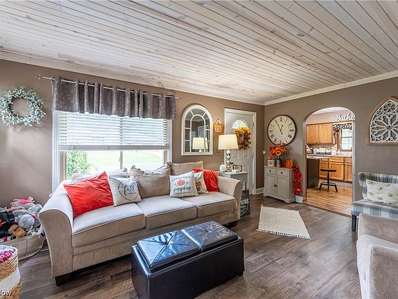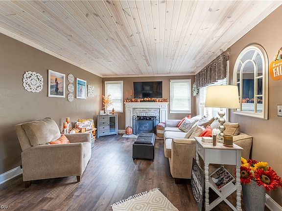 Nestled in Perry Township, within the coveted Perry Local School District, this delightful brick bungalow awaits. Situated on a corner lot, its prime location offers easy access to the serene Sippo Lake Park. Upon entering, warm tones and luxury vinyl flooring greet you in the living room, where a gas fireplace and wood planked ceiling add a cozy touch. The kitchen boasts vinyl plank flooring, a quartz countertop island, stainless steel appliances, oak cabinetry, and a stylish tile backsplash. The main floor presents two generously sized bedrooms and a full bath with knotty pine ceilings. The expansive second-floor bedroom spans the house's length, providing ample space and storage options. A rear addition on the main floor offers wide-open versatility, featuring cathedral ceilings adorned with rustic barn beams, a wood-burning stove, and luxury vinyl flooring. A convenient half bath completes the first floor. Outside, a screened-in porch lets you enjoy the outdoors bug-free, while an