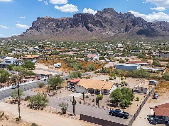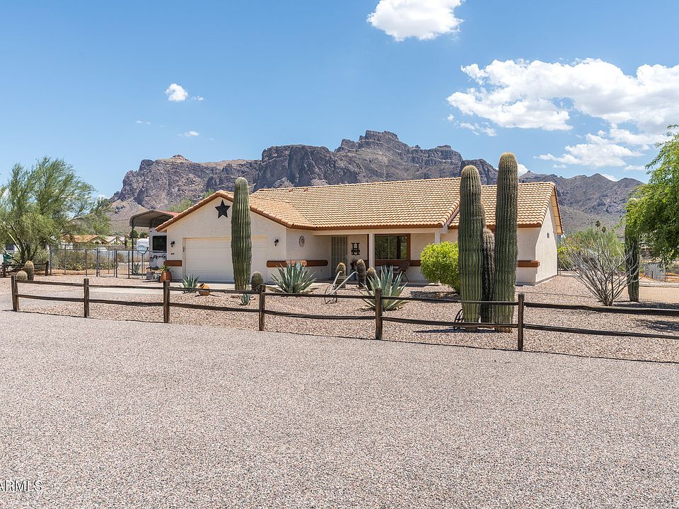 STUNNING SUPERSTITION MOUNTAIN VIEWS FROM EXTENDED COVERED PATIO & SPARKLING PEBBLETEC POOL ON 1.25 ACRES!! THIS SINGLE LEVEL 3 BEDROOM, 2 BATH HOME HAS IT ALL: ROOM FOR ANIMALS, 2 WATERING AREAS, COMPLETELY FENCED BACKYARD, 30 FT RV CANOPY, 2 CAR GARAGE, DETACHED TACK/STORAGE ROOM & OODLES OF PARKING SPACE. NO HOA! OPEN FLOORPLAN SPORTS SPLIT BEDROOMS FOR PRIVACY, GRANITE COUNTERS, SPACIOUS PRIMARY SUITE FEATURING 2019 TRAVERTINE FLOORING, 2019 TILED WALK-IN SHOWER & OVER-SIZED WALK-IN CLOSET. 2023 POOL PUMP MOTOR, 2021 EXT PAINT. EASY CARE LANDSCAPE PROVIDES TIME TO RELAX, RIDE, HIKE, SWIM & ENJOY SPECTACULAR SUPERSITION SUNSETS. SOME FURNITURE CONVEYS VIA SEPARATE CONTRACT FOR $1.