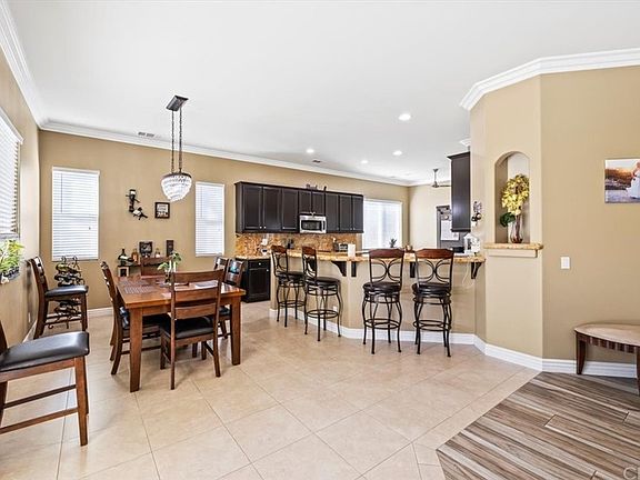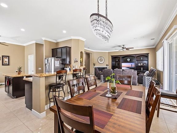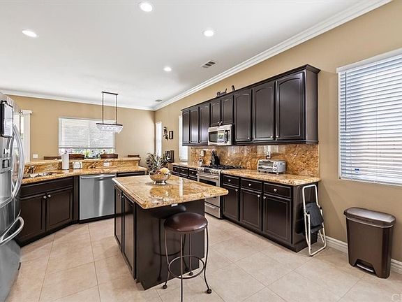 This stunning single-story residence boasts 4 bedrooms, 2 1/2 baths, with an optional 5th bedroom/bonus room, ideal for flexible living arrangements. Step into the open-concept design featuring wood-look tile flooring and a bespoke built-in entertainment center, creating a cozy ambiance. The kitchen showcases tile flooring, granite countertops, ample upgraded espresso-colored cabinets, an island, and a dining area, seamlessly connecting to the dining room and living room for effortless entertaining. Crown molding adds a touch of elegance throughout, while ceiling fans ensure comfort in every bedroom. Enjoy the convenience of an indoor laundry room. The hallway bathroom offers a private tub/shower combo, granite countertops, and double sinks for added luxury. The spacious master bathroom boasts a separate jetted marble bathtub and walk-in shower, along with double sinks and a walk-in closet, providing a retreat-like experience. Outside, discover a beautifully landscaped oasis featuring queen palms, lemon, plum, fig, orange, and cherry trees, adding to the allure of this stunning property. One year term. No smoking, stove, microwave and dishwasher included. No HOA. Renters insurance required.