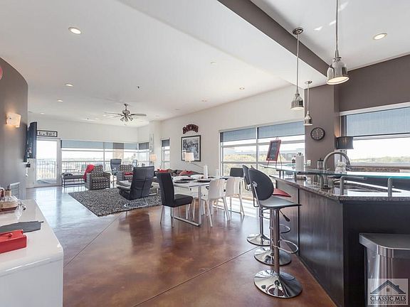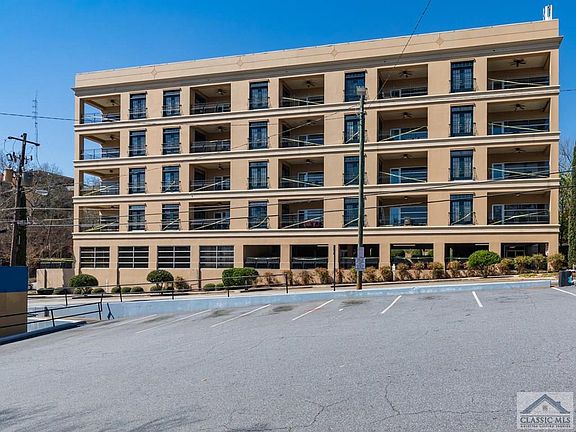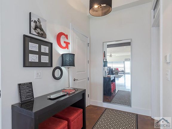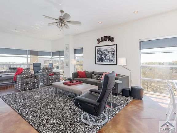 Less than 1/2 mile walk to UGA campus and Sanford Stadium on gameday! Desirable corner unit with abundant light from floor to ceiling windows allowing views of campus and Sanford Stadium from Brumby to downtown Athens. Large balcony with ceiling fan and great sunrise views. Concrete floors run throughout this open concept two bedroom, two bath unit. Tons of storage with (5.5' x 11' storage room) and walk in closet in master. Modern kitchen with granite countertop, stainless steel backsplash, French door refrigerator, under cabinet lighting and pantry pullouts. Solar shades throughout main living area, HVAC less than 3 years old. Two parking spaces included, one covered and gated. Secure card and code entry to elevator and building.