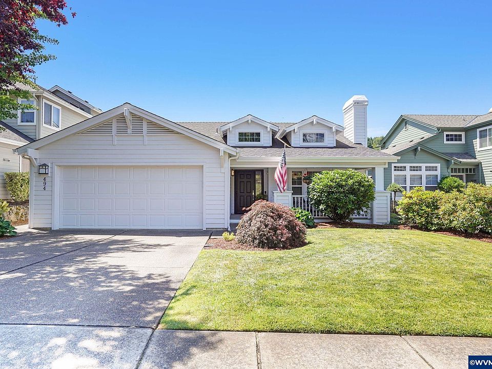 Beautiful views and golf course living! Located on the 1st Fairway at Creekside, this single-level home features an open kitchen/great room with access out to peaceful covered patio. Kitchen with slab counters, large pantry, and updated cabinets and appliances. Formal dining and living, vaulted ceilings, Brazilian cherry hardwood throughout main living areas. Large primary suite with additional patio access.