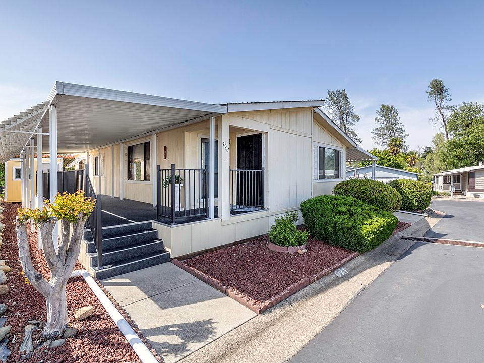 Corner lot, upgraded and super clean, located in the popular Redwoods 5-Star Senior Park. Spacious feel with high ceilings, large master suite with attached bath, two bedrooms, and two full bathrooms. Central heat and air with a new furnace. New exterior paint was just completed in April 2022. The front deck has a full-length awning, and there's covered parking for 3-cars. Space rent includes water, sewer, & trash. You'll enjoy the clubhouse with a swimming pool & spa, library, and pool tables. Affordable utility combination of Redding Electric and PG&E for natural gas. Walking distance to shopping and close to world-class fishing in the Sacramento River.