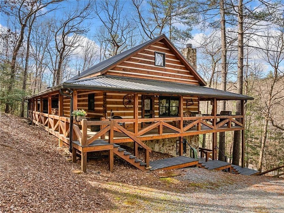 Enchanting Chink Log Cabin – Expansive Wraparound Deck & Outdoor Oasis Step into the soul of mountain living with a wrap-around porch that’s so much more than a porch—it’s an immersive outdoor experience. Freshly stained and thoughtfully designed, this expansive deck encircles the entire home and flows seamlessly into a breathtaking 20x24 covered outdoor pavilion—complete with a wood-burning stone fireplace, 5-person hot tub, and al fresco dining space. Whether you're sipping coffee with the sunrise, watching wildlife, gathering around the fire, or soaking under the stars, this seamless indoor-outdoor living invites you to relax, recharge, and reconnect. Privately nestled on a serene hillside and surrounded by lush Appalachian forest, this fully furnished 3-bedroom, 3-bath chink-style log cabin is a masterful blend of rustic charm and modern comfort. Inside, you’ll find soaring cathedral ceilings, an open kitchen with granite countertops, and a beautiful stone fireplace—all in pristine, lovingly maintained condition. Though it has never been used as a rental, this fully furnished property offers incredible income potential for short-term or vacation rental investors, thanks to its turnkey condition, outdoor appeal, and sought-after location. Just 20 minutes from downtown Blue Ridge and walking distance to the scenic Toccoa River, this home is also only 14 miles from Springer Mountain—the southern gateway to the Appalachian Trail. Whether you're seeking a private getaway, a full-time residence, or a high-performing future rental, this cabin delivers the lifestyle, location, and quality that make mountain living truly magical.
