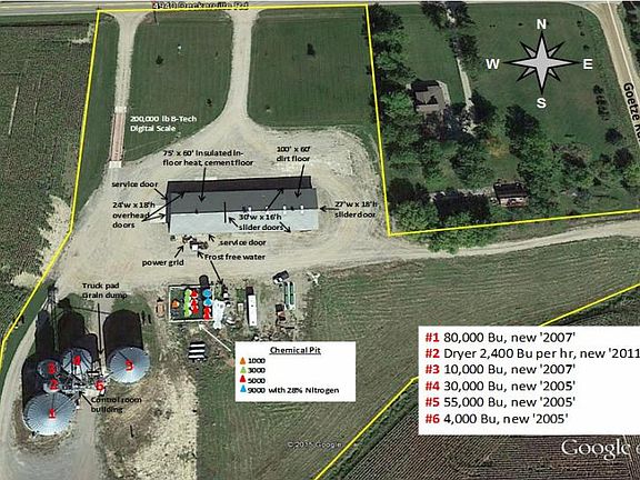 Grain dryer & storage set up. 2004 Polebarn 60 x 175 (60x75 portion insulated with cement and in-floor heat) Chemical pit w/ storage tanks. 200,000 lb B-Tech Digital Scale. control room by bins GRAIN BINS/Dryer: #1 80,000 Bu (2007) #2 Dryer 2,400 Bu per hr (2011) #3 10,000 Bu (2007) #4 30,000 Bu (2005) #5 55,000 Bu (2005) #6 4,000 Bu (2005) Access to Deckerville Rd & Goetze.