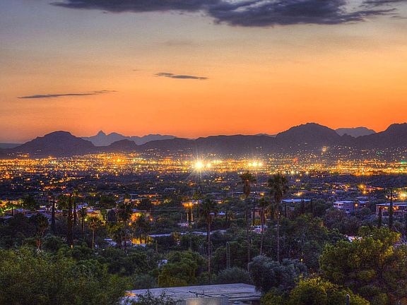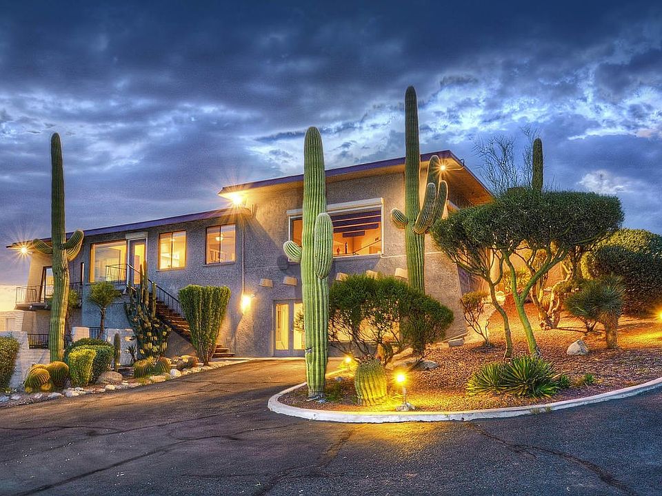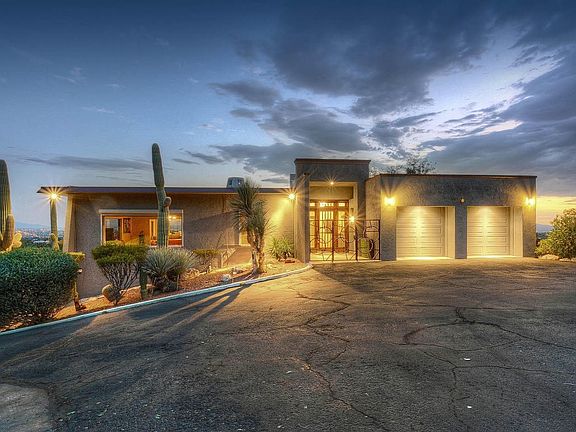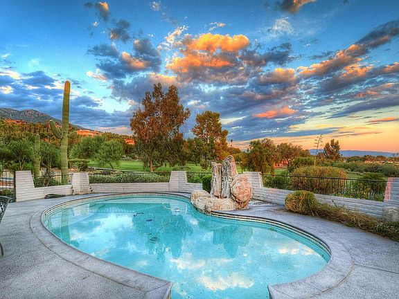 Stunning modern contemporary home situated high on a hill in Skyline Country Club Estates surrounded with mountain & city light vistas. Enter through the grand foyer into the great room with wood beam ceilings and huge picture windows that welcome the lush green golf course and the beautiful Catatlina Mountains. Large kitchen with light/bright cabinets & granite counters,formal dining includes butlers kitchen & wet bar. Spacious double master suite & bath offer private balcony with endless views. Cozy office/den has built-in bookshelves. Fabulous guest quarters with 3/4 bath and french doors that lead out to the golf course. Entertain friends and family outdoors in the refreshing pool or at your personal sand volleyball court.