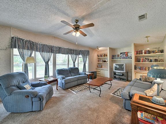 2/2 fully furnished manufactured home on lovely park-like 3 acre secluded parcel. A-1 zoning, great neighbors and no HOA. Spacious living room has built in shelves and cabinets and bay window alcove large enough to use as office. Plenty of cabinets and counter space in kitchen as well as breakfast bar. Kitchen over looks full size dining room with sliders to view the land, Master has pretty bath w/double sinks and nice walk-in shower. Second bedroom has walk in closet. Fans in almost every room! Second bath has large sink and tub with shower. Inside utility room with washer and dryer and storage. Detached two car metal carport. RV hook-up. 12 x 16 utility shed with electricity. Kids tree house playhouse. Coffee table in living room does not convey.