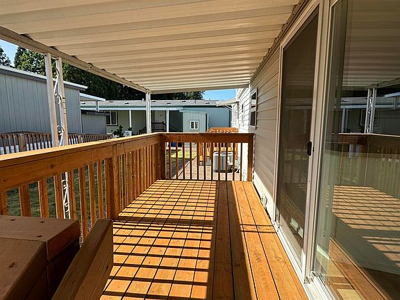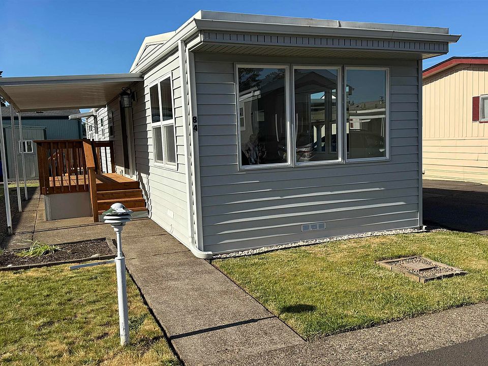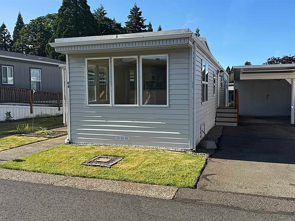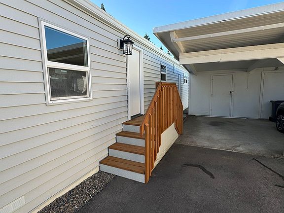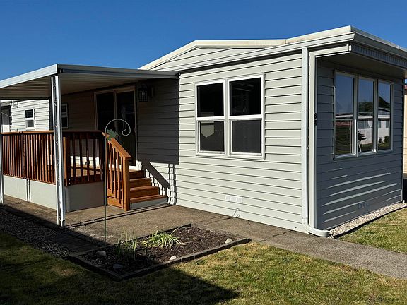 Lovely Sunnyside adult park is where this updated home is located! New furnace and heat pump, interlocking vinyl floors, new cabinets and hardware, new lighting, shower/tub, toilet, water heater, bathroom faucets etc. New interior paint. New outside decking and stairs, vinyl siding, newer windows and membrane roof. Rent includes water, sewer and garbage. Carport and storage shed/shop.