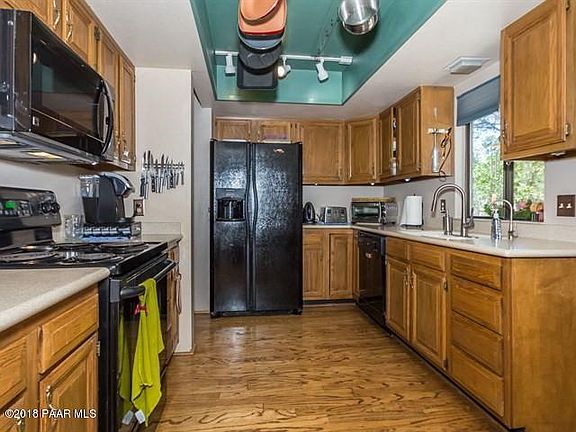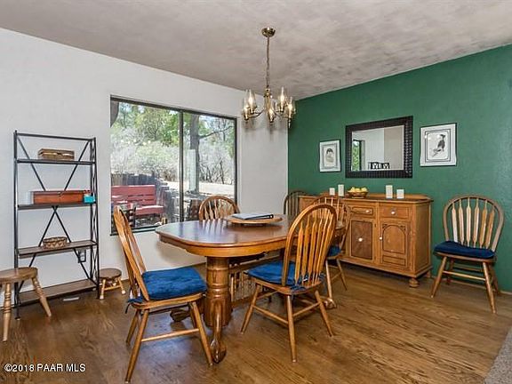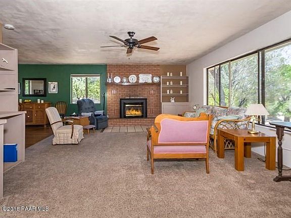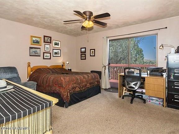Beautiful park like setting in Yavapai Hills. This peaceful retreat is an entertainers delight with built in benches, hammocks, Ponderosa Pines for shade and a producing orchard in the backyard. Enjoy the fruit from 9 mature fruit trees all on a drip irrigation system. The living space is bright with a lot of light coming in through large windows. This home has 3 bedrooms upstairs and one bedroom downstairs. The downstairs has a separate entrance that could be an in law suite or Air BNB. There are 2 fireplaces to keep you warm in the winter and all rooms have ceiling fans to cool you off in the summer. New Corian counters in the kitchen. The master suite has a private balcony with view.There is no garage, but plenty of room to build one. Home has been priced accordingly.