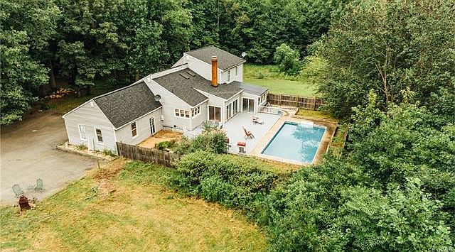Custom home on 27+ acres, close in Powhatan location that is minutes to schools, shopping & the YMCA. This unique property was custom built by the original owner and offers the perfect setting & a flexible floor plan. You'll love the vaulted ceilings, stained ship lap trim & wood floors that grace this home throughout. The Great Room is spacious, and is open to the Kitchen. The Kitchen features wood floors, vaulted ceiling & sink that is surrounded by windows, island cooktop, wall oven & microwave. Dining Room with wood floors leaves plenty of room for entertaining. Step down flex space off the Great Room is filled with sliding doors and is the perfect extension to the outdoor space & pool area. The Sun Room offers walls of windows, tile floor. 2 generous bedrooms are also on level 1, one with a walk in closet and both attached to a bath. The 2nd floor is a Master Suite is the only room on this level, three closets & a vaulted Master Bath with separate jetted tub & shower. Property is zoned for farm animals & has approx. 4 acres of open land & creek frontage. This property is aggressively priced and sold as is.