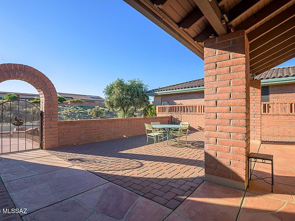 Experience the epitome of retirement living in this exquisite desert oasis, tailored for those who have a penchant for an active lifestyle amidst the beauty of the Arizona landscape. Revel in a home that truly wows, featuring a impressive fusion of classic Fairfield architecture with modern amenities, catering to the most discerning tastes. Step into an inviting courtyard, framed by a classic brick arched gate, setting the stage for the serene lifestyle that awaits within. Inside, a thoughtfully designed floor plan unfolds, boasting a kitchen that's a chef's delight. Outfitted with sleek black appliances, including GE double ovens, a gas cooktop, and abundant cabinetry topped with striking granite counters, this space is further complemented by a separate walk-in pantry ready to accommodate all your culinary storage needs. The living areas are graced with offset wood-look tile flooring, enhancing the ambiance while framing the mountain views visible through the expansive triple patio door. For those who enjoy entertaining, a built-in serving bar complete with a wine fridge offers a refined touch ideal for hosting gatherings. An expanded den becomes a versatile retreat, equipped with a two-station built-in desk, ideal for computer work, crafting, or hobbies. Privacy is paramount with the split bedroom arrangement, placing the spacious primary suite at the back of the home. Its ensuite bath features a large wraparound dual-sink vanity adorned with granite tops, ensuring a spa-like experience every day. Outside, the wraparound patio, coupled with an expansive paver area, offers various seating arrangements for entertaining. There is even a mini-split in the garage for hobby enthusiasts! Whether you're captivated by the sunrise to the east or the mesmerizing interplay of colors over the Santa Rita Mountains in the evening, this home promises a lifetime of unforgettable moments. Welcome to a place where each day is more extraordinary than the last!