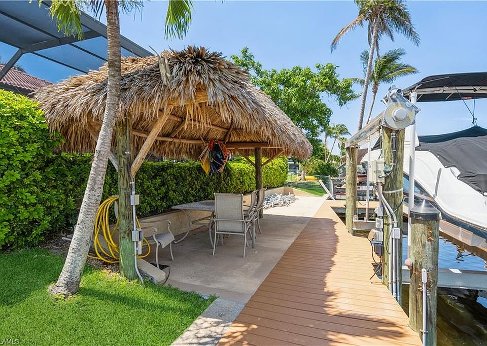 - Exterior features: Dock, Outdoor Kitchen, Outdoor Shower, Boat Canopy/Cover, Boat Lift, Tiki Hut