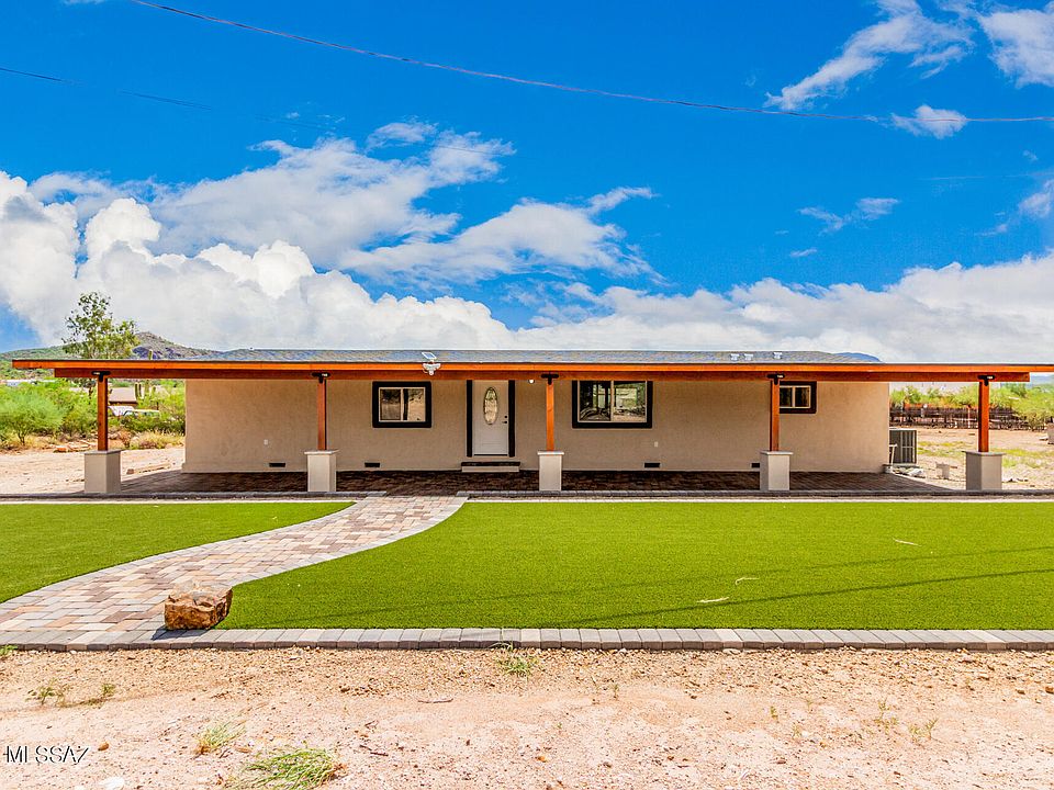 Range Price $249K-$259K. This 4-bedroom property, nestled in a sprawling one-acre lot with breathtaking mountain vistas awaits its new owner. Be greeted by the lush artificial turf and a full-length front porch. Inside, an open floor plan bathes in a soothing palette, highlighted by wood-look flooring and a spacious great room. Kitchen comes with sleek built-in cabinets adorned with crown molding and gleaming counters. The Primary bedroom has a closet and an ensuite featuring a shower & tile combination. Unwind on the deck or covered patio and enjoy the panoramic mountain views that won't disappoint. The expansive backyard offers endless possibilities, whether you envision a sparkling pool or a personal touch of landscaping artistry. This gem won't last long . New stove and kitchen hood will be installed. Per Pima county development services you are allowed to have 1 horse per 10,000 SqFt. A maximum of 4 horses for this property.
