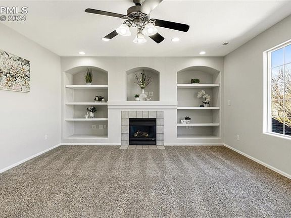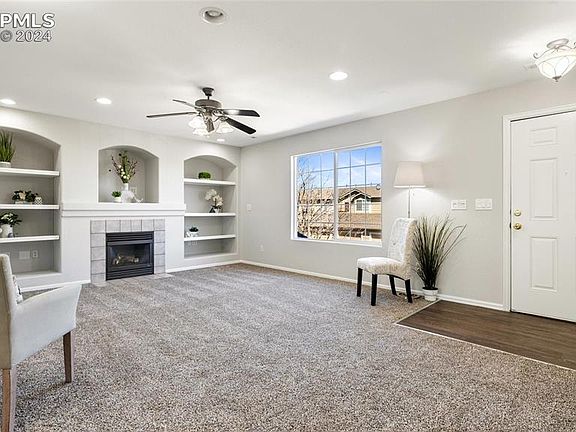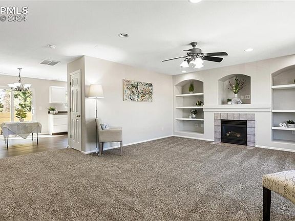 Gorgeous updated second floor condo. Enter into a large living room with built-in shelves and gas fireplace. An open, spacious kitchen provides lots of cabinetry, counter space and an island. Dining room walks out to a private deck. Large primary bedroom with a large closet and adjoining bathroom. Two additional bedrooms with large closets and an additional full bath. The whole home has just been repainted, brand-new carpet throughout, new LVP flooring in entry, bathrooms, kitchen and dining. 1 assigned parking space. Sand Creek Commons is located near Peterson Space Force Base, Colorado Springs Airport and easy access to Powers corridor.
